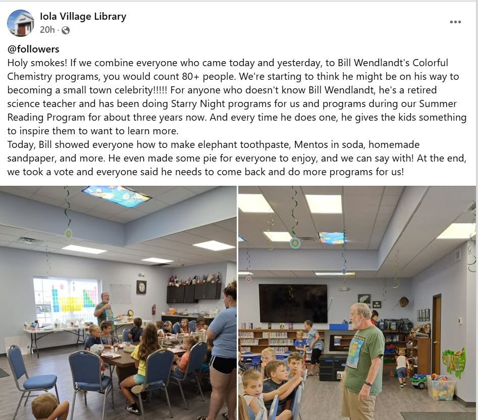 SCHOOL LIBRARY BOOKS: There is an allegation on Facebook that the Iola-Scandinavia School District is taking “3,000 books” out of the libraries and wonders what is being done to them. According to Chris Nelson, district administrator, “The District’s Board and Administration are aware of this allegation and have addressed it. The District is proud of the access our students have to books and other resources through our library system. Like other school-based library staff, the District’s library professionals are hard at work to make sure we have the books and other resources necessary for our curriculum, specifically and generally to encourage a love of reading. They make sure we have titles in current, accessible formats and remove/replace obsolete and/or damaged items. They are often working with the other professional staff within our District and library professionals across the State of Wisconsin to support our students.”